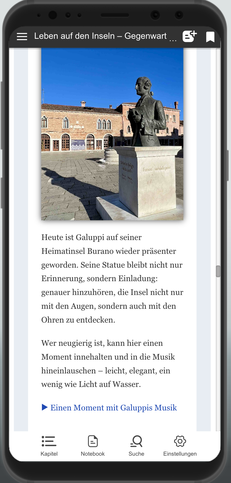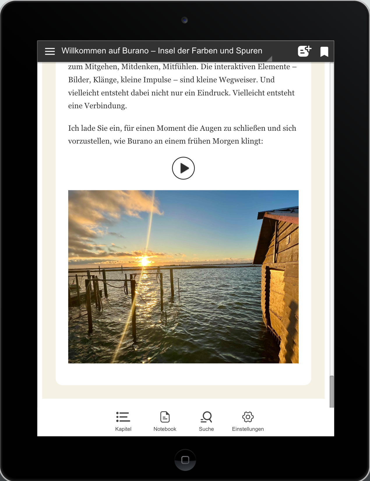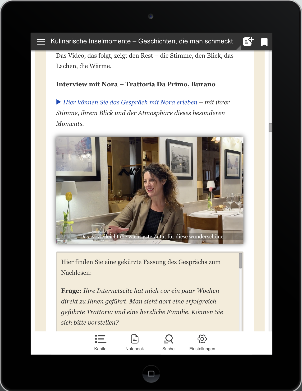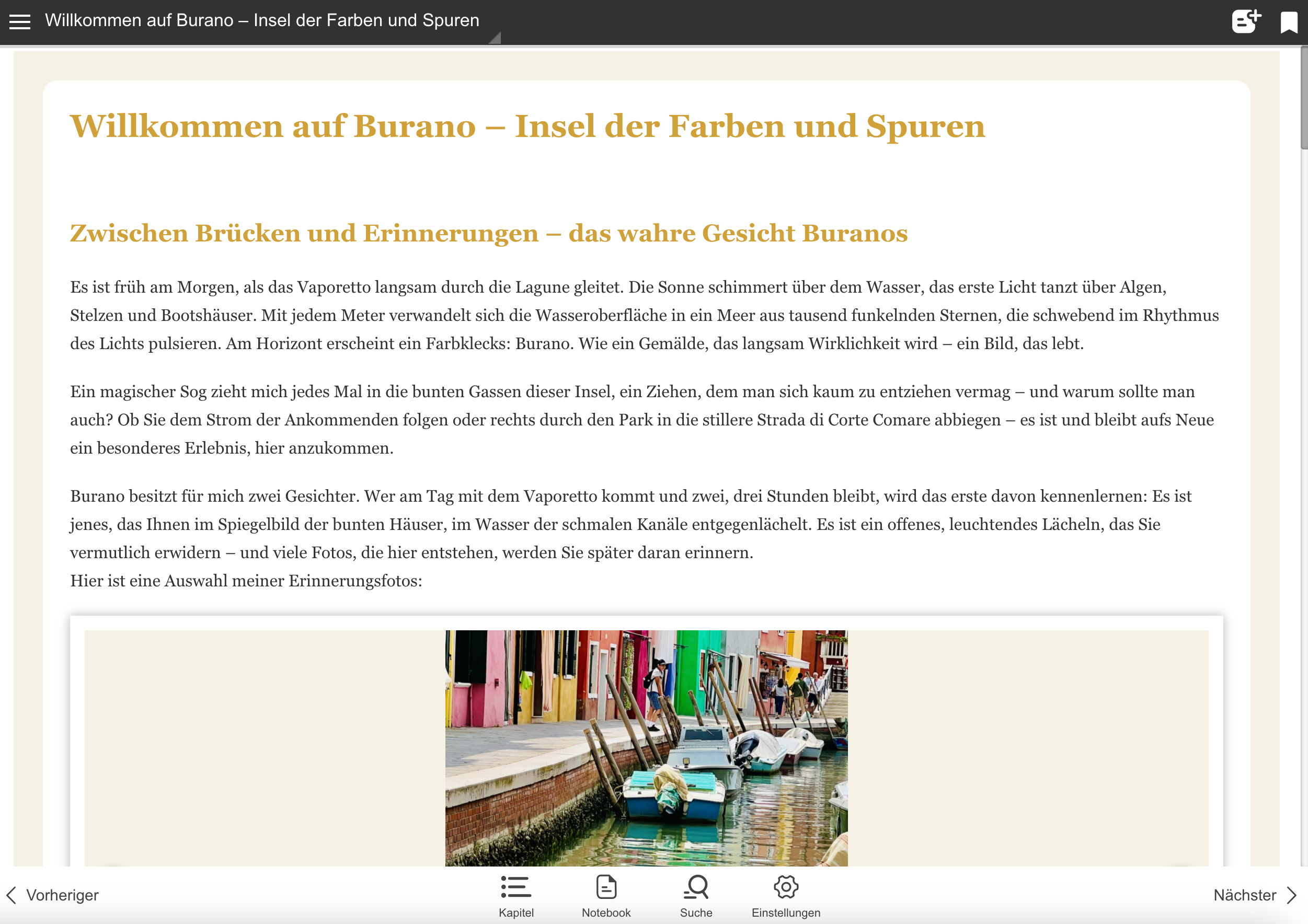 Ein besonderer Schwerpunkt liegt auf persönlichen Einblicken und authentischen Begegnungen. In Interviews und multimedialen Elementen kommen Menschen zu Wort, die auf Burano leben und arbeiten. Ergänzt wird das E-Book durch Videos, Fotos und interaktive Inhalte, die ein intensives und vielschichtiges Reiseerlebnis ermöglichen.