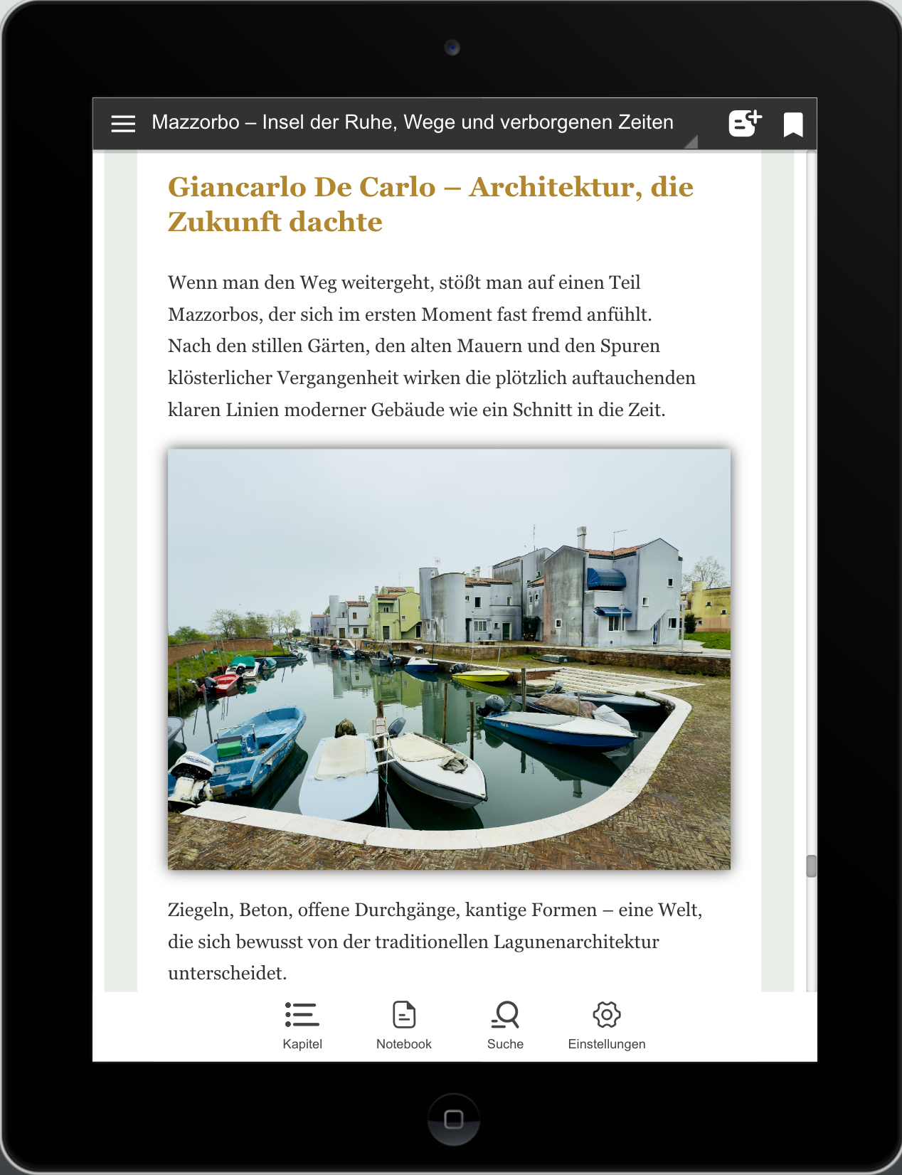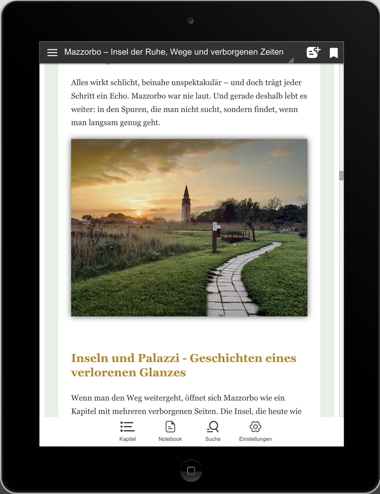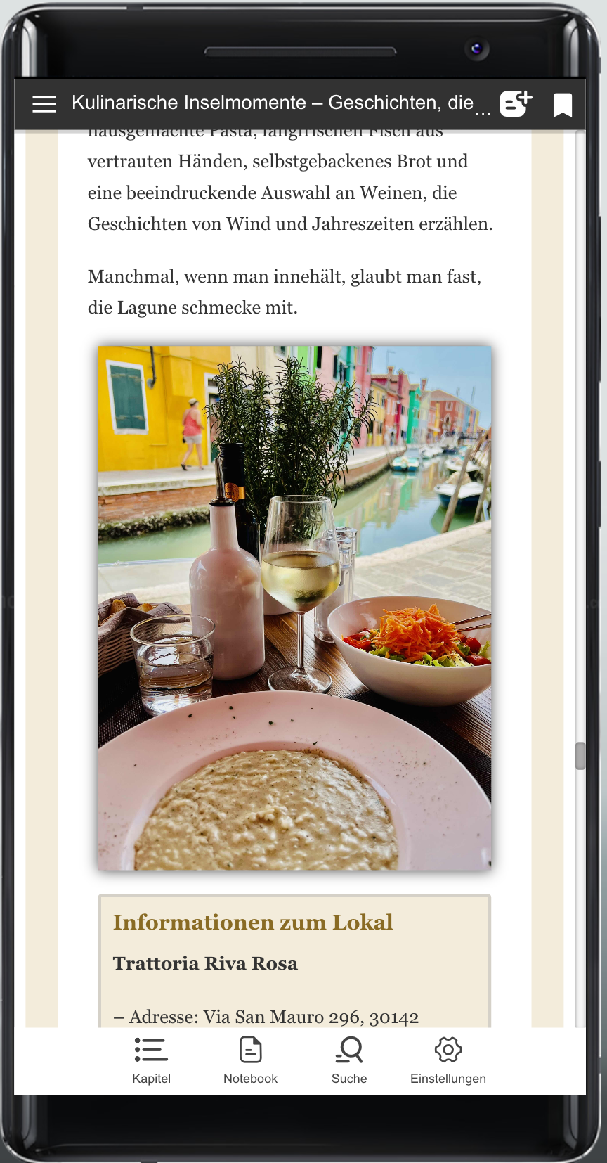 Ein besonderer Schwerpunkt liegt auf persönlichen Einblicken und authentischen Begegnungen. In Interviews und multimedialen Elementen kommen Menschen zu Wort, die auf Burano leben und arbeiten. Ergänzt wird das E-Book durch Videos, Fotos und interaktive Inhalte, die ein intensives und vielschichtiges Reiseerlebnis ermöglichen.