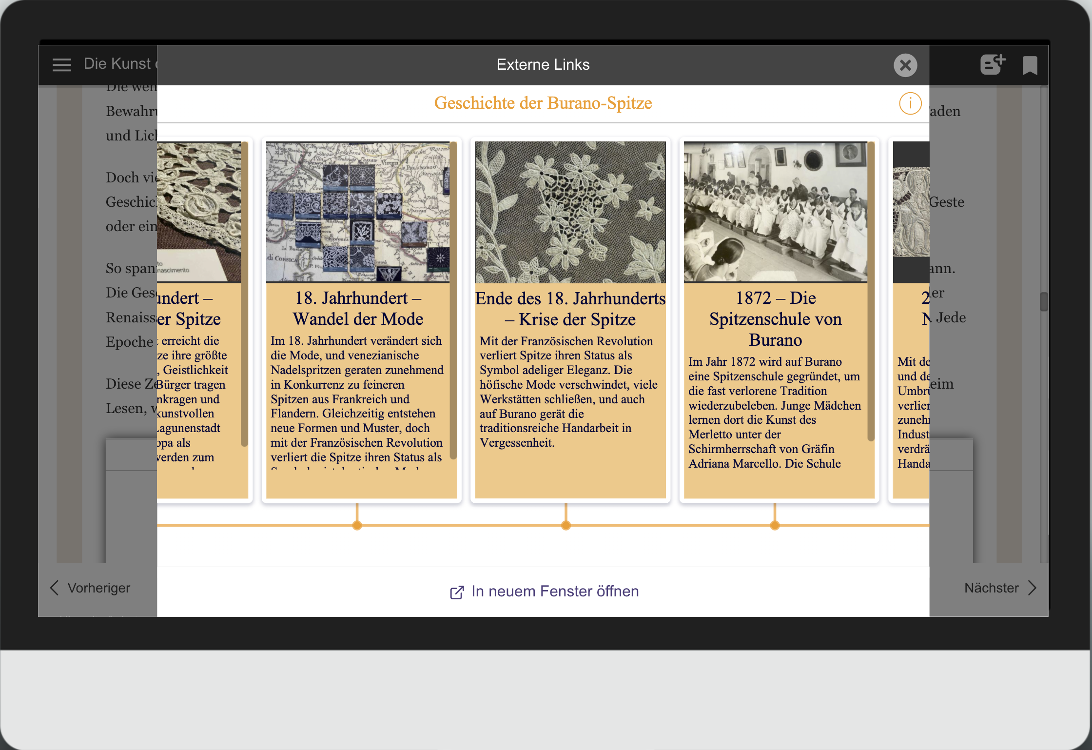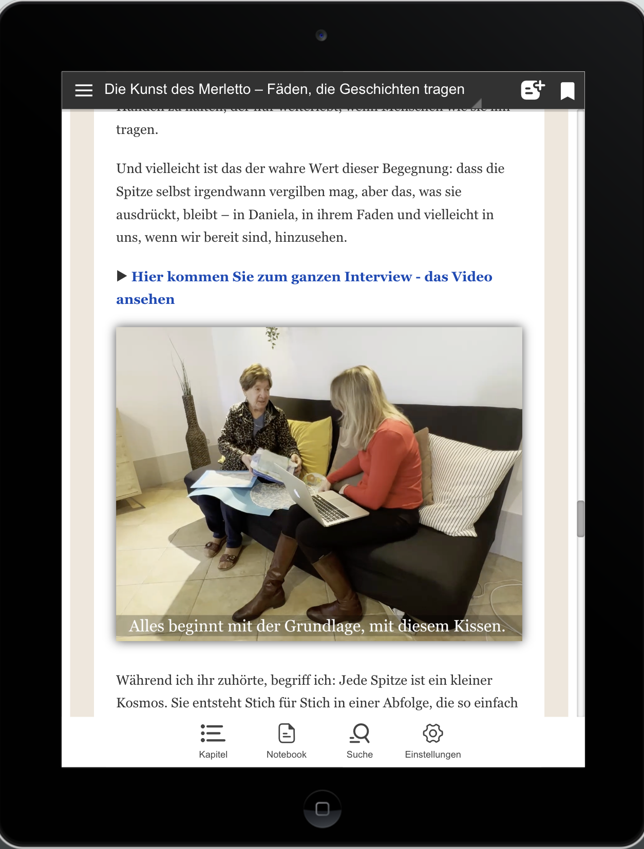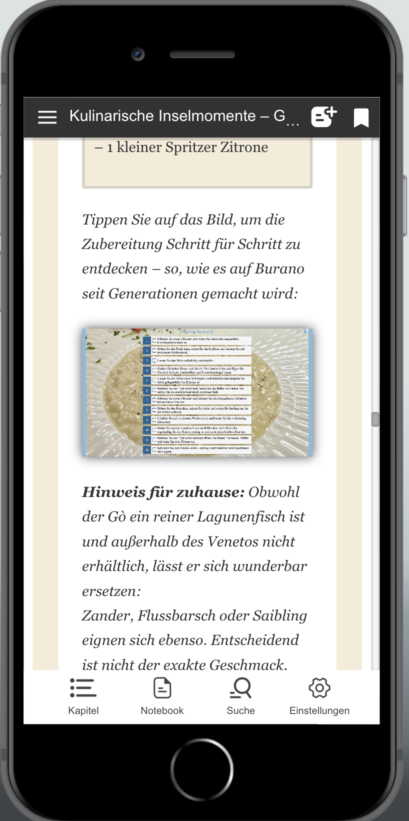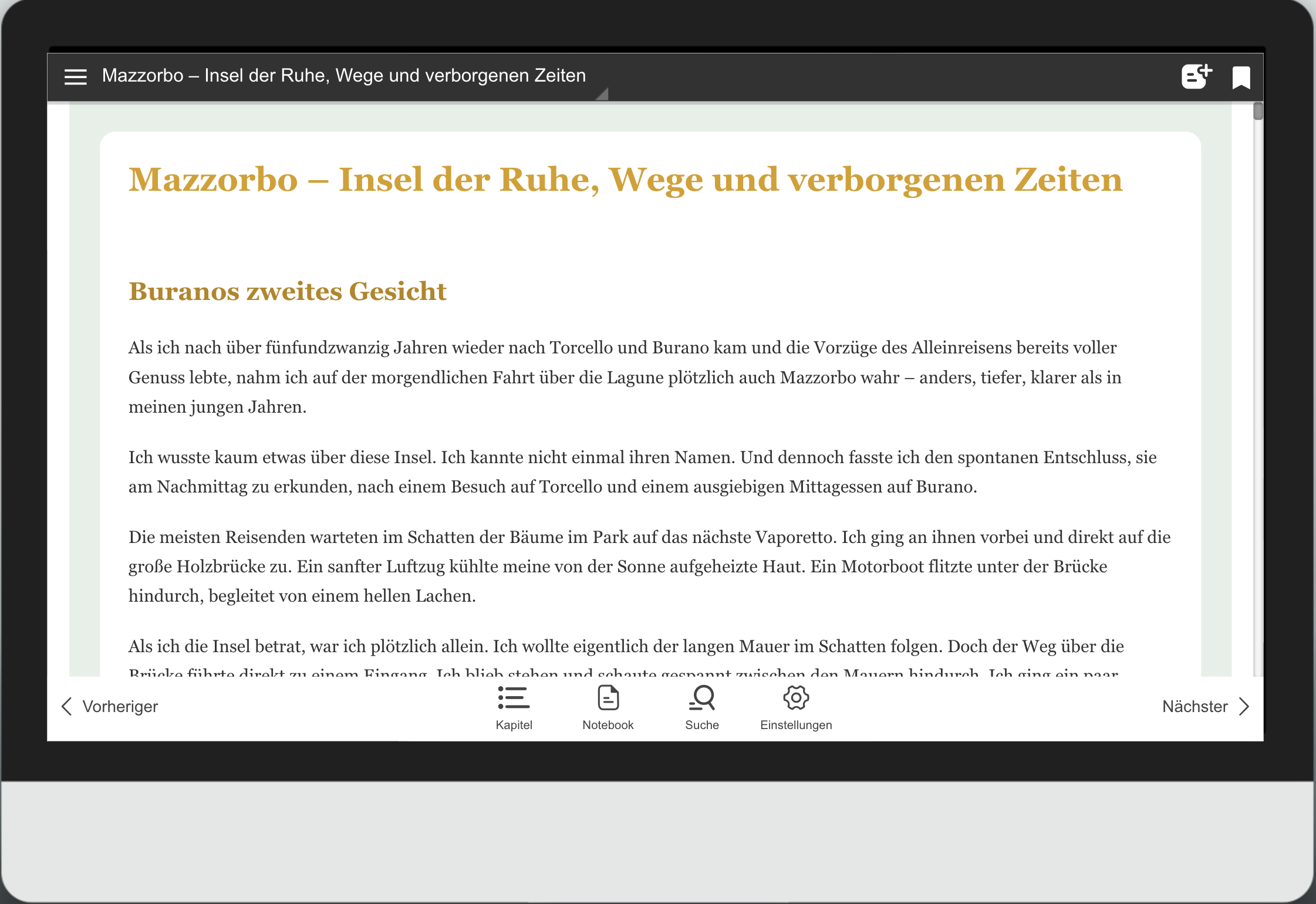 Ein besonderer Schwerpunkt liegt auf persönlichen Einblicken und authentischen Begegnungen. In Interviews und multimedialen Elementen kommen Menschen zu Wort, die auf Burano leben und arbeiten. Ergänzt wird das E-Book durch Videos, Fotos und interaktive Inhalte, die ein intensives und vielschichtiges Reiseerlebnis ermöglichen.